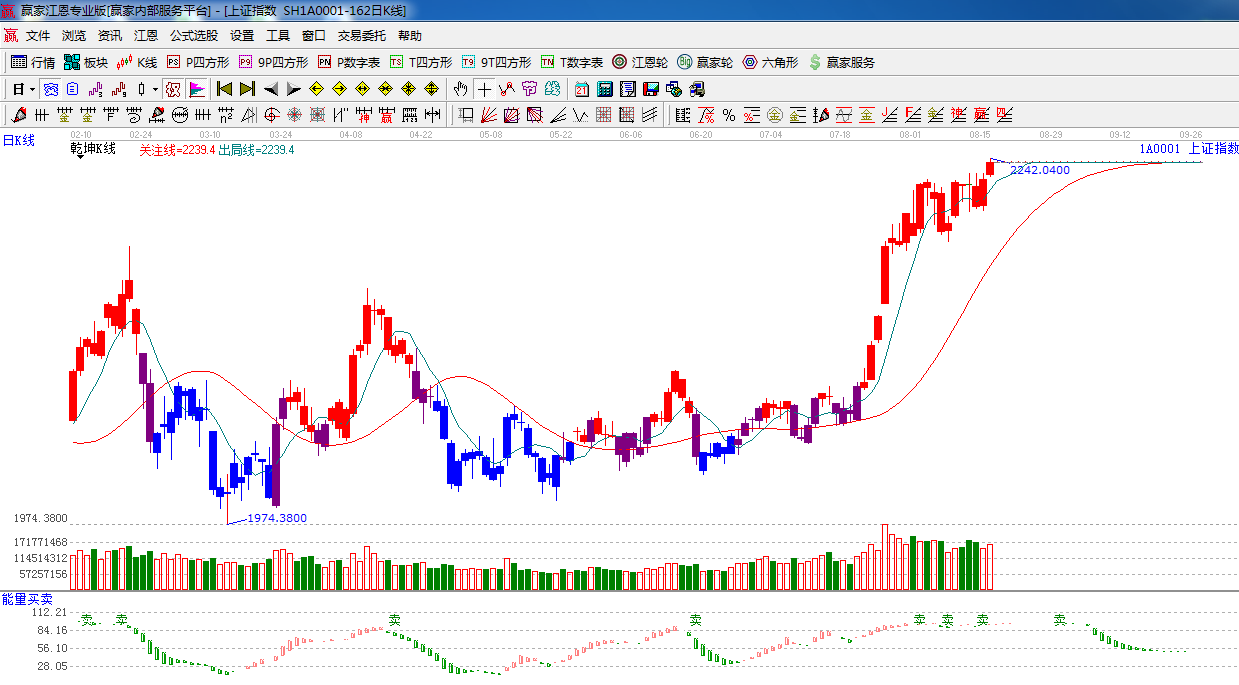 ★依據(jù)贏家江恩系統(tǒng)波段百分比提示:跳空突破180度2232點,進(jìn)一步延伸阻力 位225度是2254點,240度2261點,180度2232轉(zhuǎn)換為支撐。