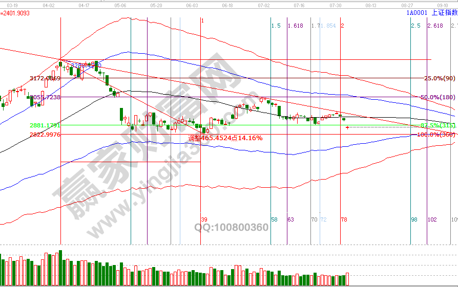 7月2號(hào)3048點(diǎn)(江恩價(jià)格四方形測(cè)算3051點(diǎn))、30號(hào)2965點(diǎn)(百分比測(cè)算2966點(diǎn)),贏家江恩大勢(shì)分析無論是從時(shí)間、還是大盤點(diǎn)位均提前做出測(cè)算并給出應(yīng)對(duì)策略,大方向在7月13號(hào)、20號(hào)公開視頻課講到下半年策略,指數(shù)測(cè)算8月底、9月會(huì)出現(xiàn)一個(gè)關(guān)鍵低點(diǎn),江恩時(shí)間四方形測(cè)算,8月時(shí)間窗口是9號(hào)、16號(hào)、24號(hào)(向后推是26號(hào));本周關(guān)注波段百分比延伸線120度(2791點(diǎn))至180度(2834點(diǎn)),計(jì)劃波段倉(cāng)會(huì)開始分批參與。在市場(chǎng)回調(diào)期,贏家技術(shù)團(tuán)隊(duì)已于7月24號(hào)在VIP學(xué)員區(qū)公布關(guān)注板塊,這兩個(gè)板塊經(jīng)過測(cè)算是波段機(jī)會(huì)(1-3月),會(huì)成為調(diào)整期明星板塊。8月5號(hào)盤中壓力是45度2877點(diǎn)、90度2894點(diǎn),盤中支撐是315度2844點(diǎn)、270度2829點(diǎn),8月時(shí)間窗口9號(hào)、16號(hào)、24號(hào)。操作策略,指數(shù)極反通道生命線進(jìn)入弱勢(shì)通道,按失守一線看低一線規(guī)則藍(lán)色下軌線是目標(biāo)位,短線機(jī)會(huì)跟蹤60分鐘周期,投資者保持3成以內(nèi)或空倉(cāng)。