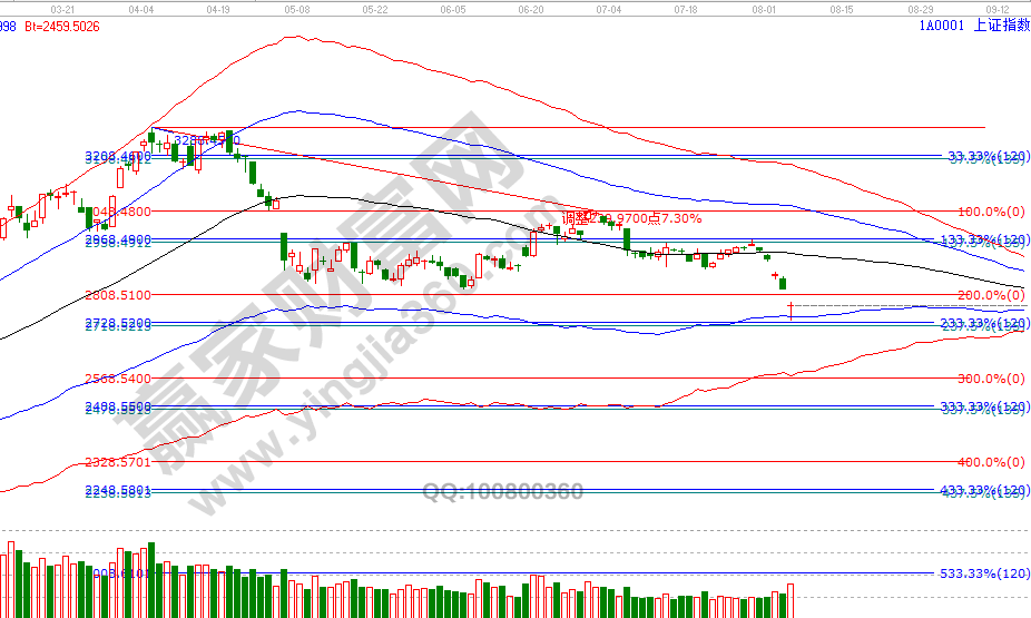 大盤1號失守極反通道生命線,6號觸及藍色下軌線止跌,失守一線看低線,市場再次用行動確認贏家江恩系統(tǒng)規(guī)則的實戰(zhàn)有效性,早盤未開盤前在贏家江恩系統(tǒng)學(xué)員區(qū)發(fā)圖,日線藍色下軌線2744點與60分鐘紅色外軌線形成周期共振信號,此位置是激進者短線博弈參考位,按歷史規(guī)律日線藍色下軌線會有反復(fù)確認的動作,整體此處反抽的空間是波段百分比延伸線180度2834附近。8月7號盤中壓力是120度2791點、180度2800點,盤中支撐是45度2757點、0度2743點時間方面,8號立秋,9號時間窗口,隨后就是16號。操作策略,指數(shù)極反通道生命線進入弱勢通道,到達藍色下軌線是目標位,激進者按周期共振信號控制在3成倉交易。