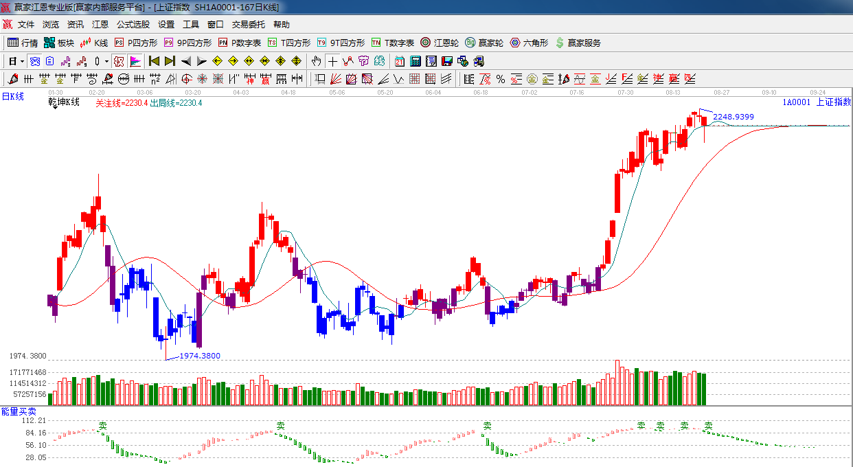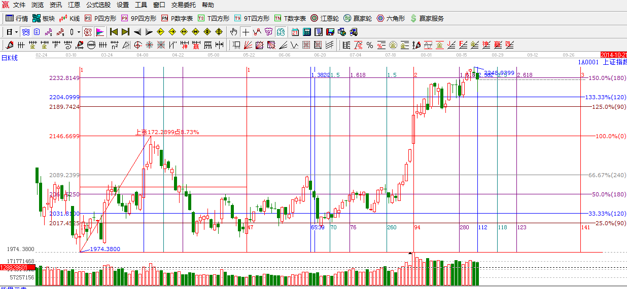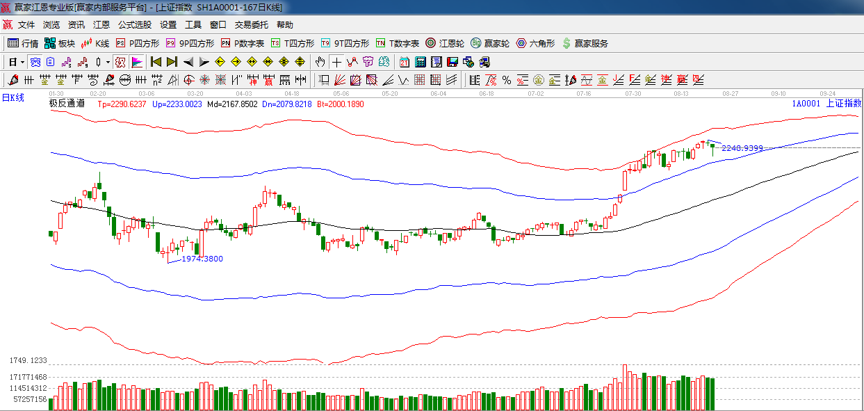 ★依據(jù)贏家江恩系統(tǒng)極反通道提示:周四如期回探,終盤吊頸線收盤,下方藍色外軌線支撐是2200點。