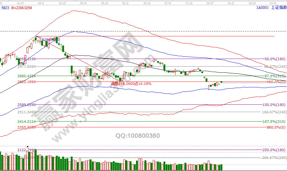 6號(hào)開盤前贏家江恩系統(tǒng)VIP學(xué)員區(qū)發(fā)周期共振圖,指數(shù)觸及極反通道藍(lán)色下軌線2744點(diǎn)后激進(jìn)者開倉,并于當(dāng)天收盤分析中給出反抽目標(biāo)位是波段百分比延伸線180度2834附近,今日指數(shù)高開上攻正好到13號(hào)分析的反壓位2829點(diǎn)回落,學(xué)員區(qū)繼12號(hào)提示分批第一次減倉獲利后,今日早盤觸及15分鐘藍(lán)色上軌線再度做圖分析達(dá)到獲利了結(jié)條件。隨著時(shí)間窗口、目標(biāo)價(jià)臨近,代表價(jià)格將再會(huì)進(jìn)入一次較大波動(dòng)期,另外早盤談到科技股短期高點(diǎn)形成,激進(jìn)者剩余最后一批倉可以以百分比延伸線120度2791為參考線。8月15號(hào)盤中壓力是225度2815點(diǎn)、270度2829點(diǎn),盤中支撐是135度2786點(diǎn)、90度2772點(diǎn),本周五日線時(shí)間窗口。操作策略,指數(shù)生命線下弱勢(shì)區(qū)運(yùn)行,激進(jìn)者3成倉交易,穩(wěn)健者空倉休息。