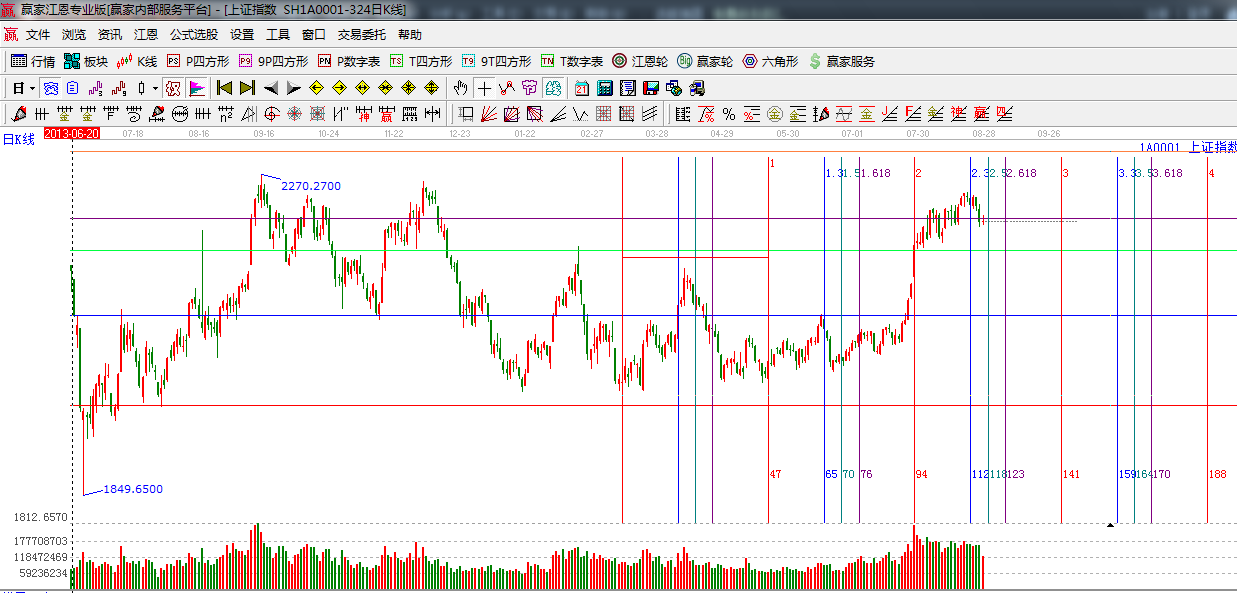 ★依據(jù)贏家江恩系統(tǒng)乾坤K線提示:紫色十字星,紫色k線代表警示,出局線短線看空,紅色關(guān)注線決定波段。