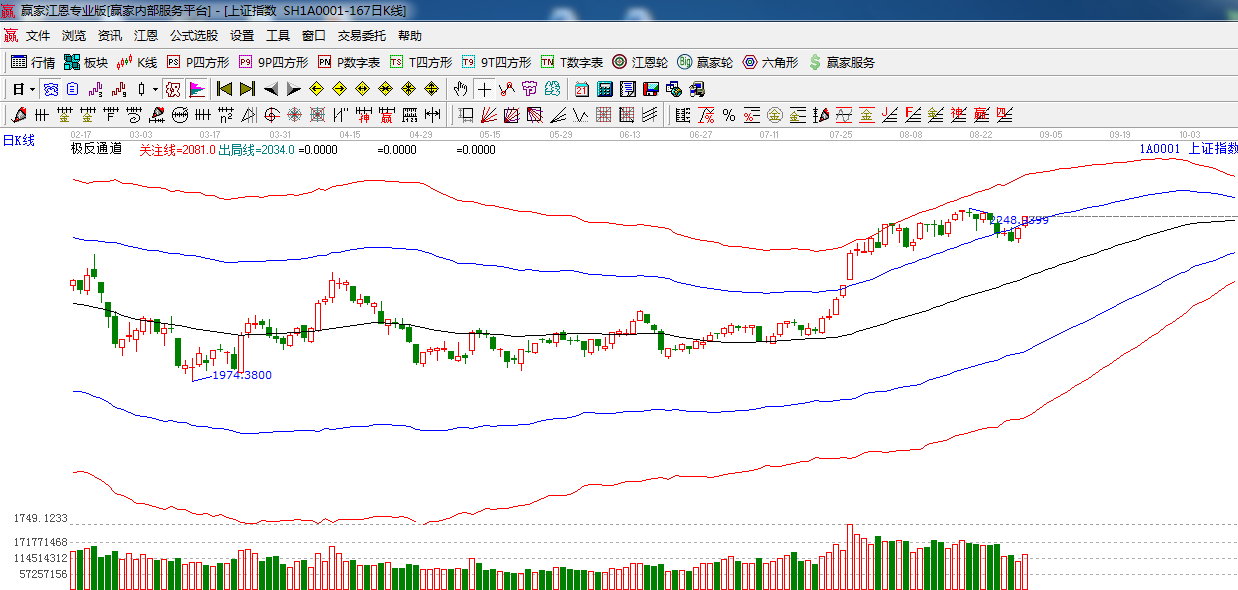 盤面上,,創(chuàng)業(yè)板強(qiáng)勢(shì)領(lǐng)漲,早盤航天軍工概念集體拉升,帶動(dòng)指數(shù)走高,另外,網(wǎng)絡(luò)安全,基因測(cè)序等表現(xiàn)較好,銀行,煤炭,保險(xiǎn)等表現(xiàn)較弱,截止收盤,中陽線報(bào)收,再次放量突破了極反通道藍(lán)色外軌線,短周期生命線支撐2220附近,預(yù)計(jì)明日高位震蕩為主。