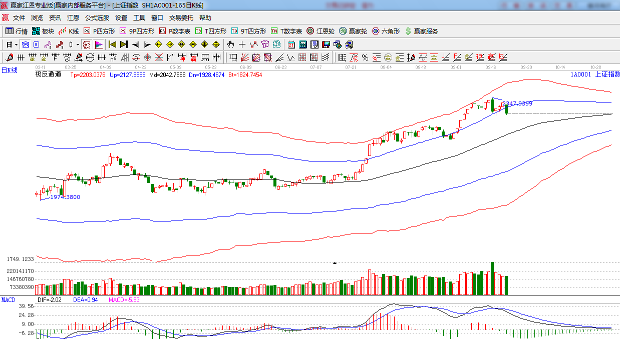 周一滬深兩市雙雙低開(kāi),盤(pán)中破位極反通道藍(lán)色外軌線,隨后一路調(diào)整,終盤(pán)以長(zhǎng)陰線報(bào)收,截至收盤(pán),滬指報(bào)2289.87點(diǎn),跌1.7%,成交1478億元;深成指報(bào)7895.87點(diǎn)跌1.88%,成交1720億元。