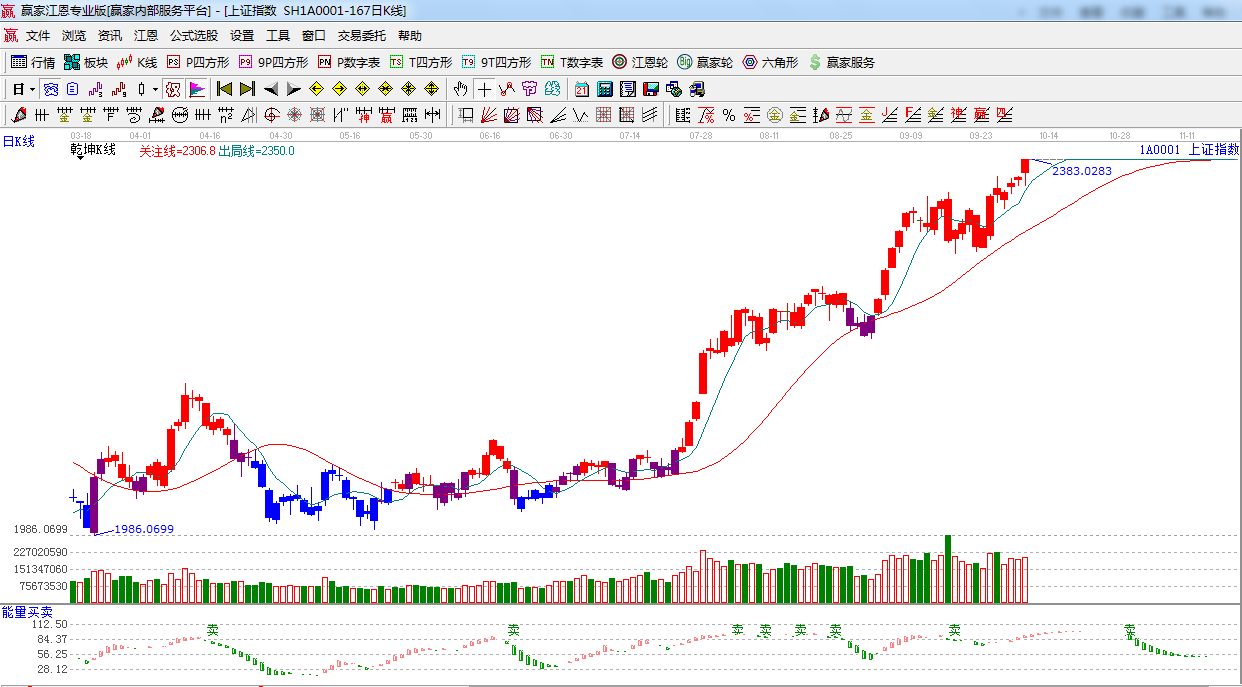 ★依據(jù)贏家江恩系統(tǒng)乾坤K線提示:綠色出局線之上,短線看多,波段看多。