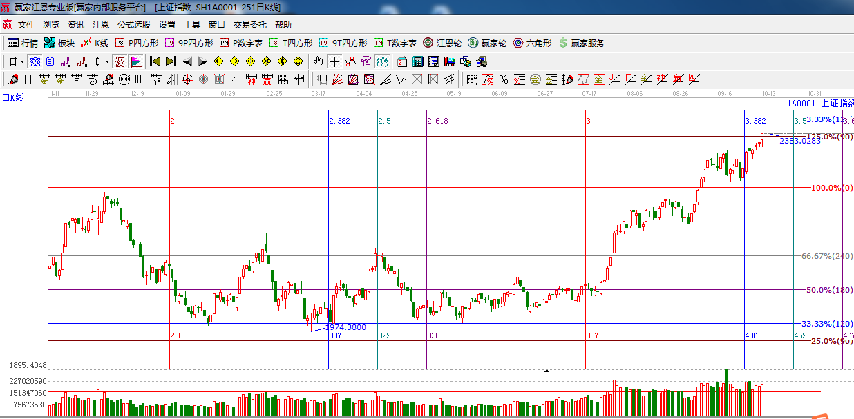 ★依據(jù)贏家江恩系統(tǒng)波段百分比提示:作圖1849點(diǎn)-2270點(diǎn)做延伸線,今日突破90度2376點(diǎn)阻力,依據(jù)規(guī)則阻力轉(zhuǎn)換支撐,短期上方阻力位是120度2411附近,