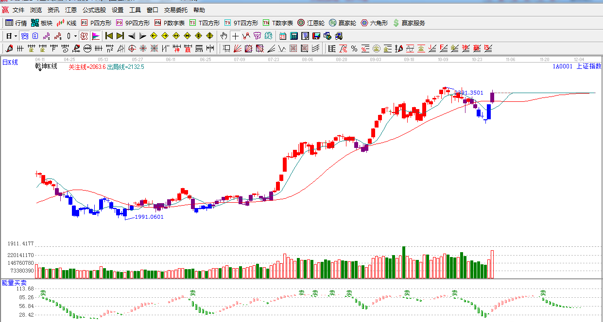 ☆依據(jù)贏家江恩系統(tǒng)乾坤K線提示:指數(shù)從下向上突破紅色關(guān)注線,k線由藍色轉(zhuǎn)變?yōu)樽仙揪€,短期謹慎看多。