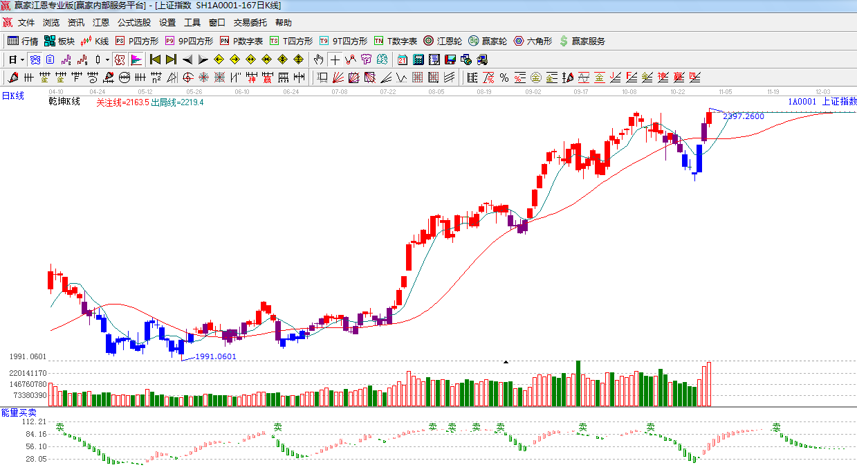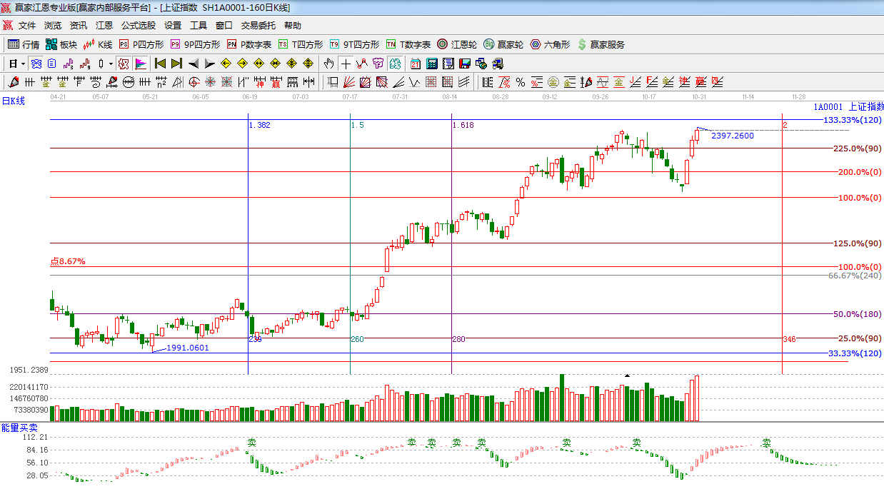 ☆依據(jù)贏家江恩系統(tǒng)波段百分比提示:指數(shù)繼續(xù)震蕩走高,突破前期高點2391點,下一阻力位是江恩120度2410點,