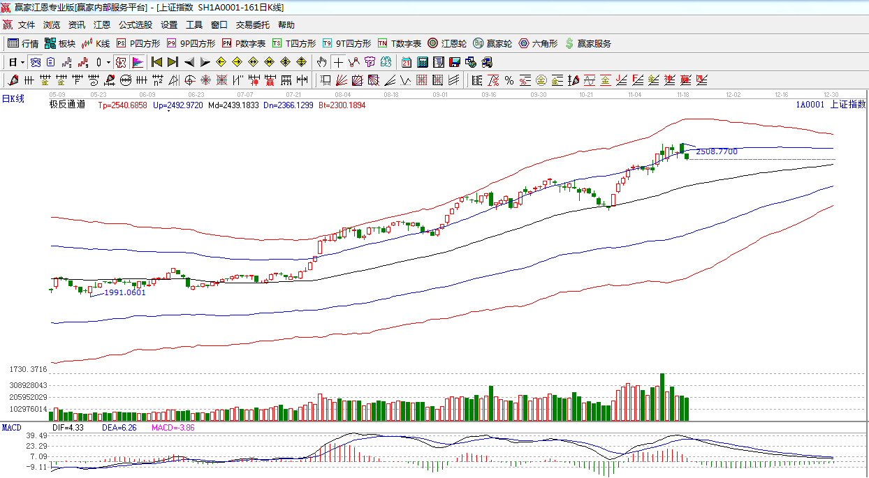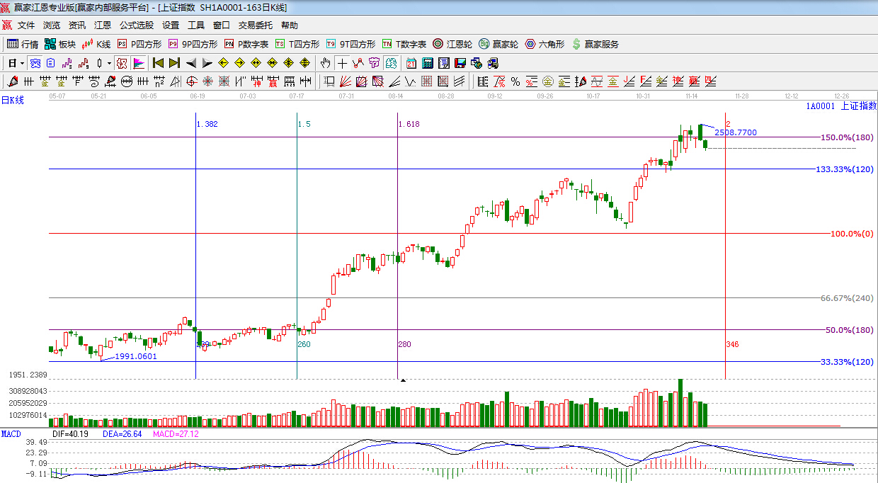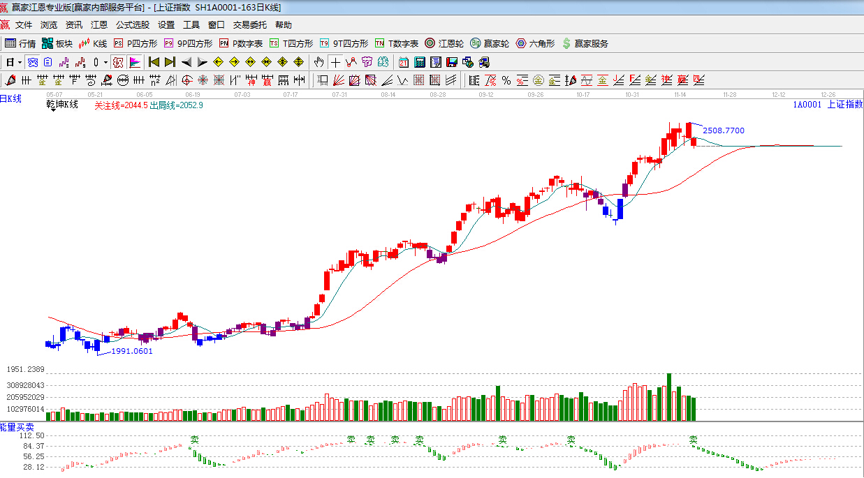 江恩看盤綜述:依據(jù)贏家江恩技術(shù)工具分析得出:昨日指數(shù)破位180度后,今日如期震蕩下行,11月11日的天量壓力需更時間來消化,所以短期市場震蕩調(diào)整走勢有望延續(xù),下方調(diào)整短期目標位是江恩120度2410點或10月高點2391點。操作上,可適當關(guān)注滬港通標的稀缺性品種,比如中藥、白酒、軍工、以及重組題材股。