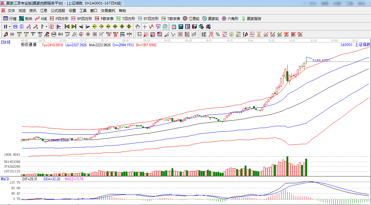 極反通道提示:指數(shù)沿紅色外軌線,繼續(xù)震蕩走高,依據(jù)規(guī)則外軌線不破,整體看多趨勢不變。