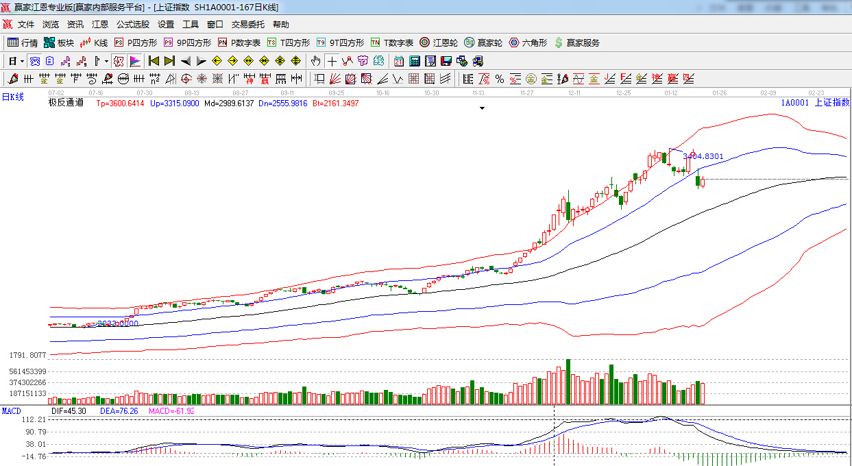極反通道提示:滬指低開震蕩反彈,短線阻力位藍(lán)色外軌線,外軌線3270點(diǎn)。
