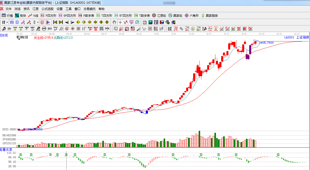 ☆依據(jù)贏家江恩理論系統(tǒng)能量買賣提示:紅色多頭能量柱加長(zhǎng),短線看多。