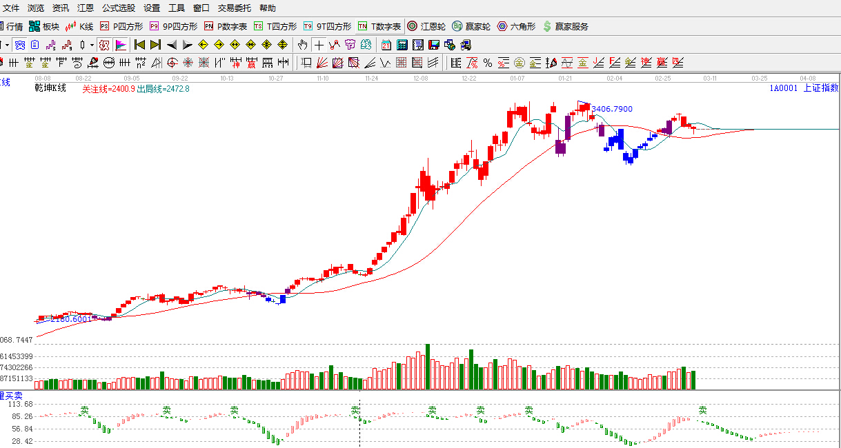 ★依據(jù)贏家江恩理論系統(tǒng)乾坤K線提示:紅色k線區(qū)域,短線出局線之下,紅色關(guān)注線之上,紅色線不破,波段看多。