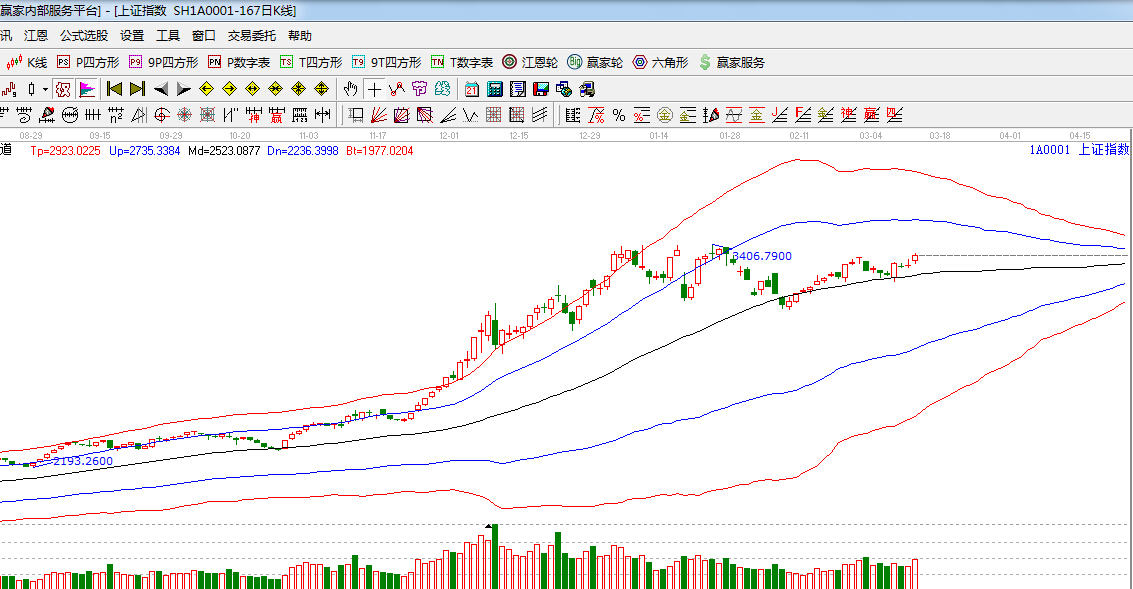 極反通道提示:前期圍繞30,60周期震蕩,今日在金融權重帶動下上行,以小陽線報收,預計短期震蕩為主,中期趨勢不變。