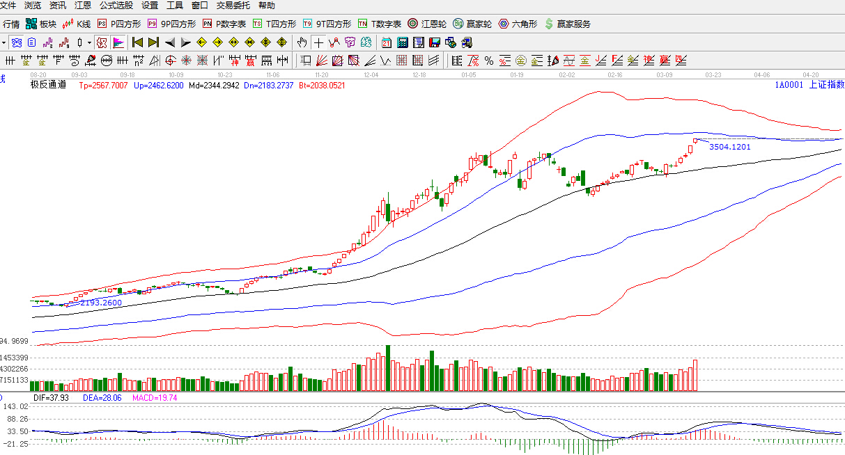 極反通道提示:滬指強(qiáng)勢(shì)突破09年的3478點(diǎn)高位,向下一下一目標(biāo)位藍(lán)色外軌線駛?cè)?,極反通道藍(lán)色外軌線3551點(diǎn)附近