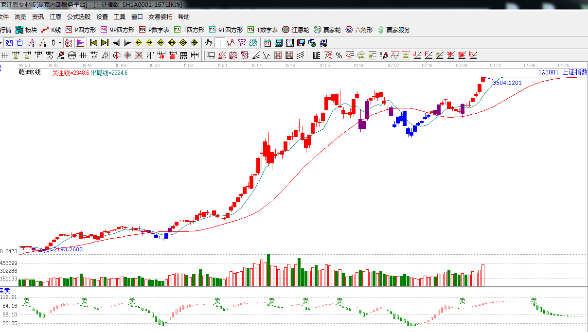 ★依據(jù)贏家江恩理論系統(tǒng)乾坤K線提示:紅色k線,可操作區(qū)域,趨勢(shì)看多。