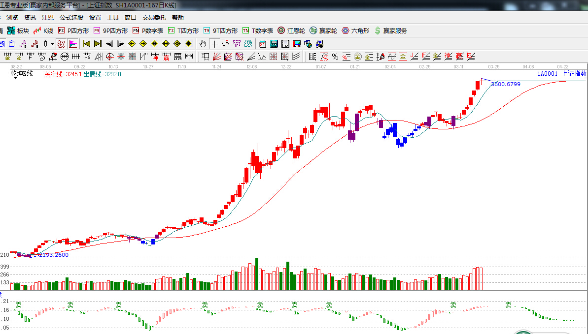 ★依據(jù)贏家江恩理論系統(tǒng)乾坤K線提示:紅色k線,可操作區(qū)域,趨勢看多。
