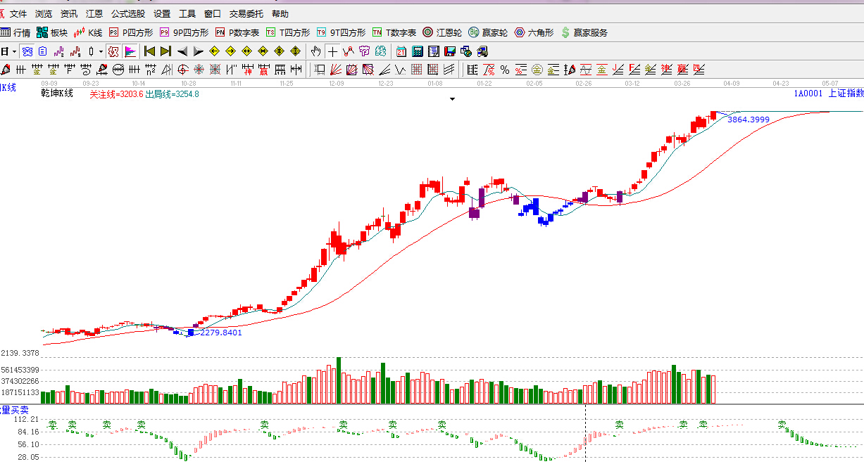 ★依據(jù)贏家江恩理論系統(tǒng)乾坤K線提示:紅色k線,綠色線上方,留意綠色短線出局線,綠色線不破,繼續(xù)看多。