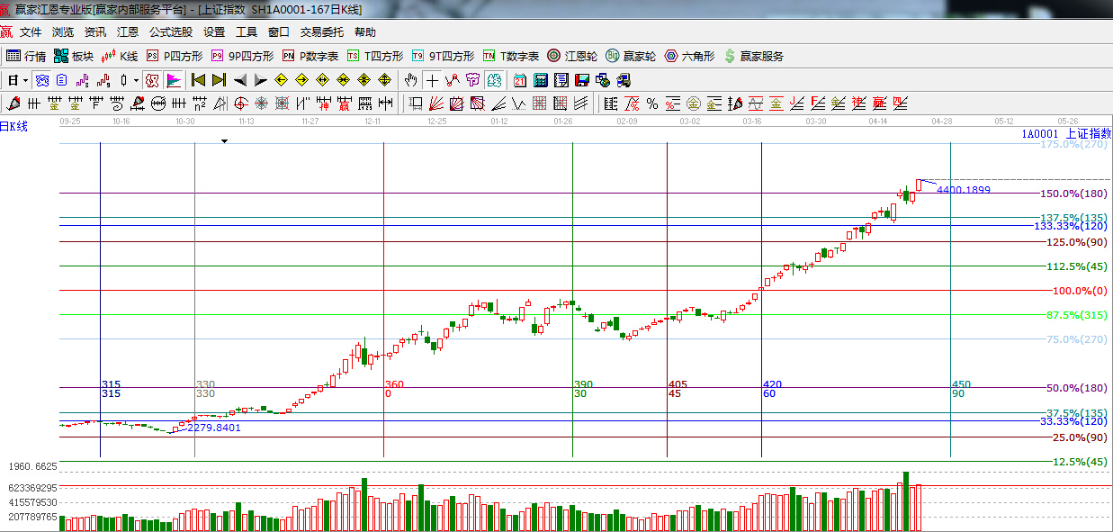 ★依據(jù)贏家江恩理論系統(tǒng)波段百分比提示:江恩百分比180度4300點附近支撐線,此位置不破整體趨勢不變,上方下一目標位是270度,4700點附近。