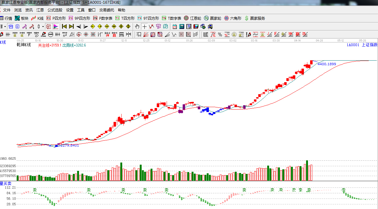 ☆依據(jù)贏家江恩理論系統(tǒng)能量買賣提示:有“賣”字出現(xiàn),指標鈍化,謹慎看多。