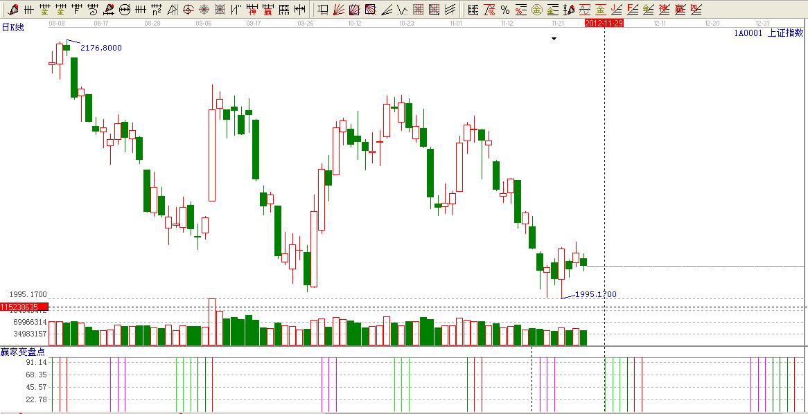 ☆依據(jù)贏家江恩系統(tǒng)乾坤k線提示:大盤還是處于藍(lán)色區(qū)域,看空信號(hào)。
