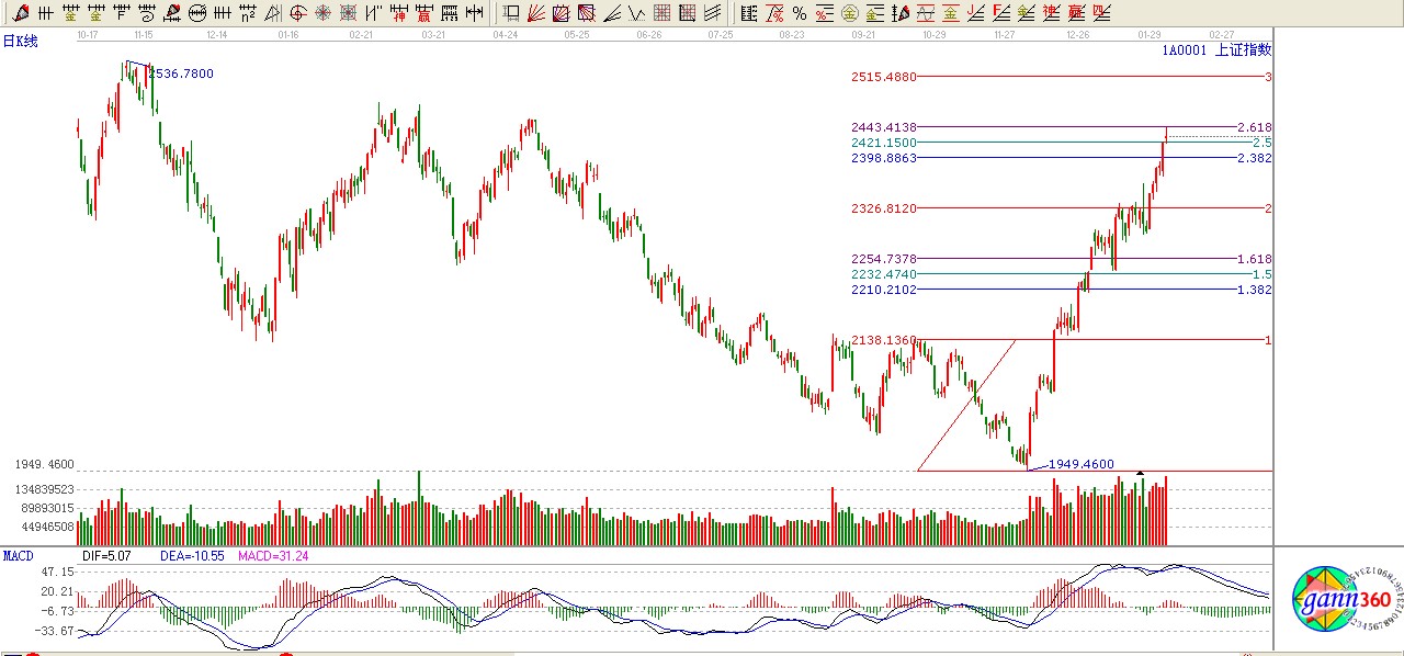 綜上所述:大盤極反通道藍色上軌位置不破,按照極反通道應用法則看高一線至2457點,短期黃金分割2.382位置震蕩難免。