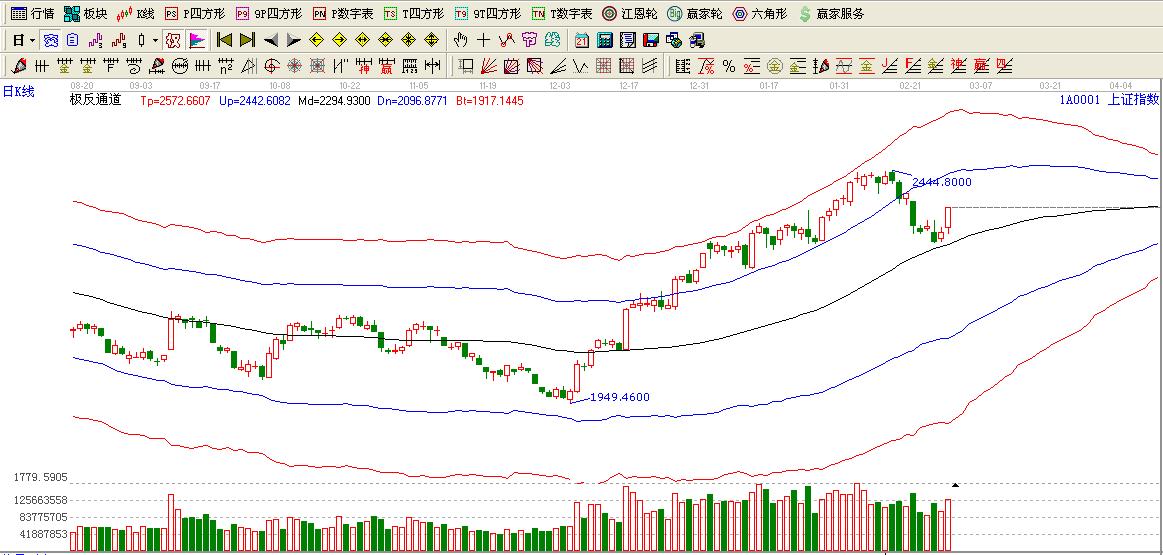 綜上所述:大盤處于極反通道生命線2294.90點附近,按照極反通道應(yīng)用法則極反通道生命線不破看高一線至2442點藍色上軌位置。
