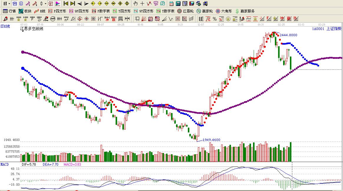 ★依據(jù)贏家江恩多空戰(zhàn)線提示:目前大盤運行在長期紫色多空線附近,短期藍(lán)色線上方,謹(jǐn)慎做多。