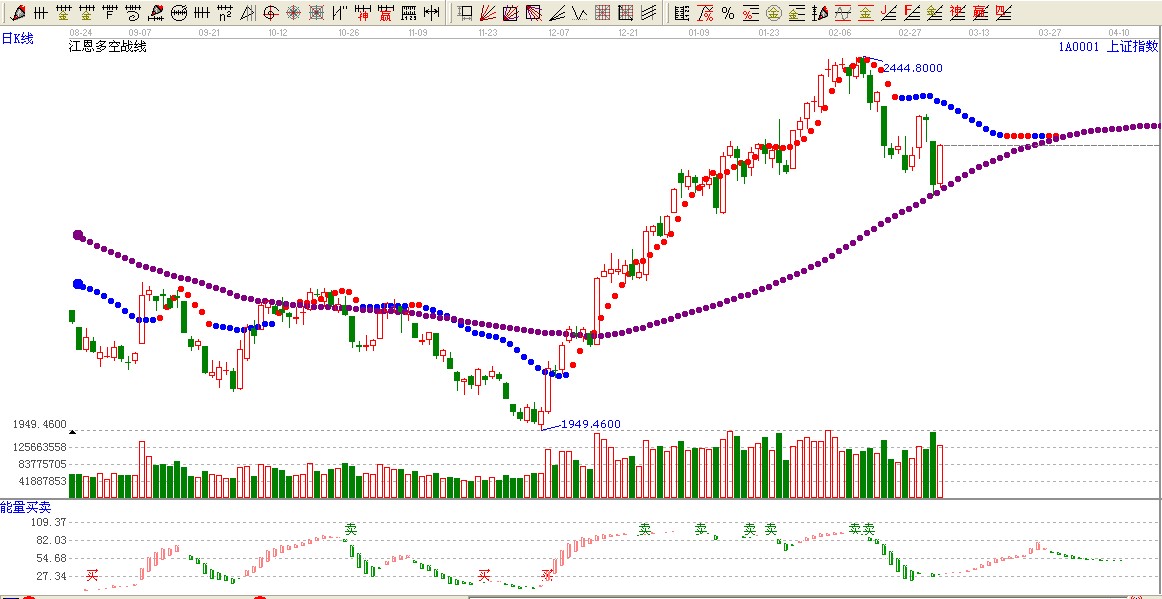 ★依據(jù)贏家江恩多空戰(zhàn)線提示:目前大盤運(yùn)行在長期紫色多空線附近,短期藍(lán)色線上方,謹(jǐn)慎做多。