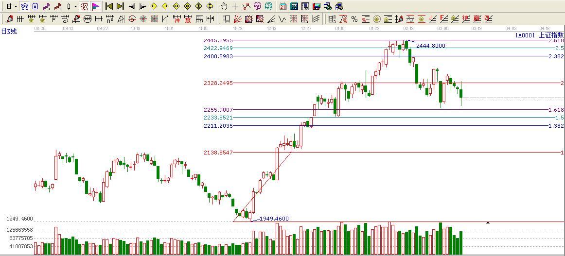 ☆依據(jù)贏黃金價(jià)格延伸線提示:大盤回踩2倍延伸位置2325點(diǎn)再度失手,此位置不過看跌至1.618位置2252點(diǎn)附近