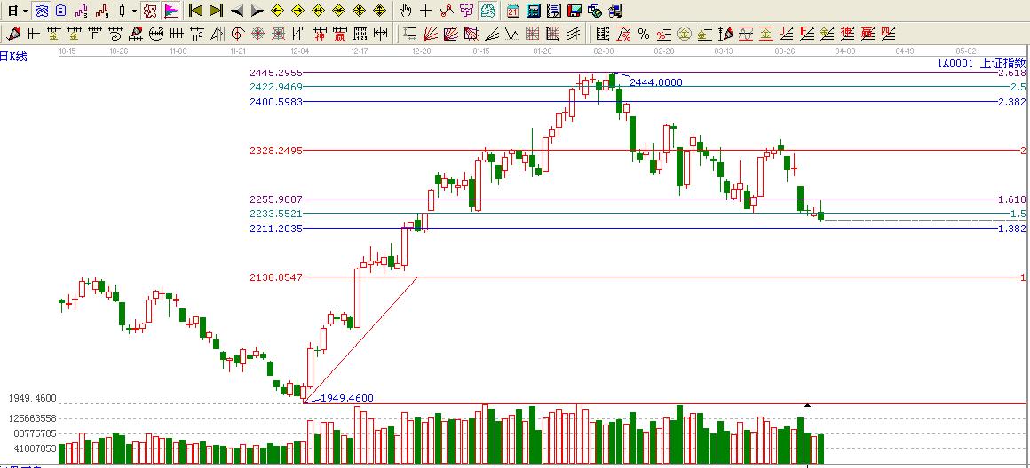 ☆依據(jù)贏黃金價(jià)格延伸線提示:大盤再4次考驗(yàn)黃金分割延伸1.5位置2230附近支撐最終失守,下方支撐1.382位置2211點(diǎn)。