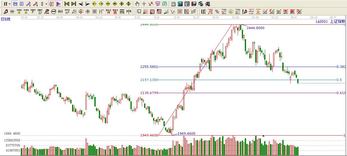 ☆依據(jù)黃金價格回調(diào)支撐位提示:大盤1949.46點至2444.80點回調(diào)目前處于180度位置2197.13點下方,短期不過看低一線至0.618位置2138.67點。