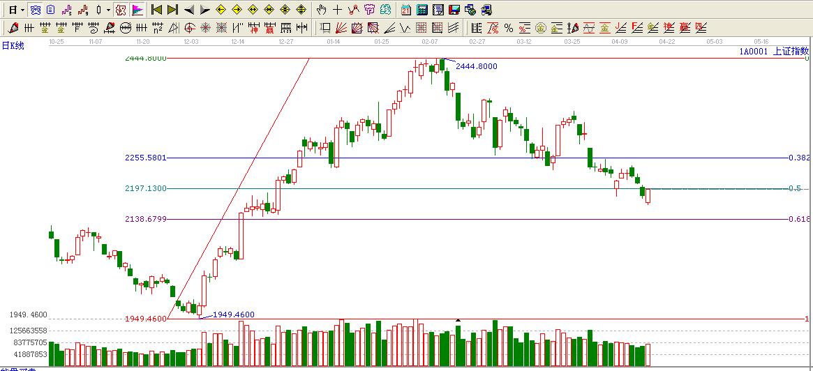 ☆依據(jù)黃金價格回調(diào)支撐位提示:大盤1949.46點至2444.80點回調(diào)目前處于0.5位置2197.13點下方,只有上行至0.5位置上方才會觸摸0.382位置2255.58點。
