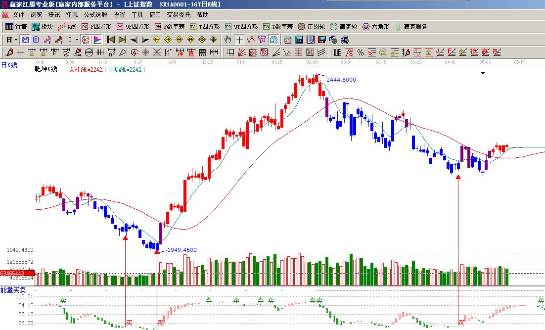 ★依據(jù)贏家乾坤k線提示:K線回踩短期線獲得支撐后上攻,紅色安全區(qū)域看多,如圖(1);