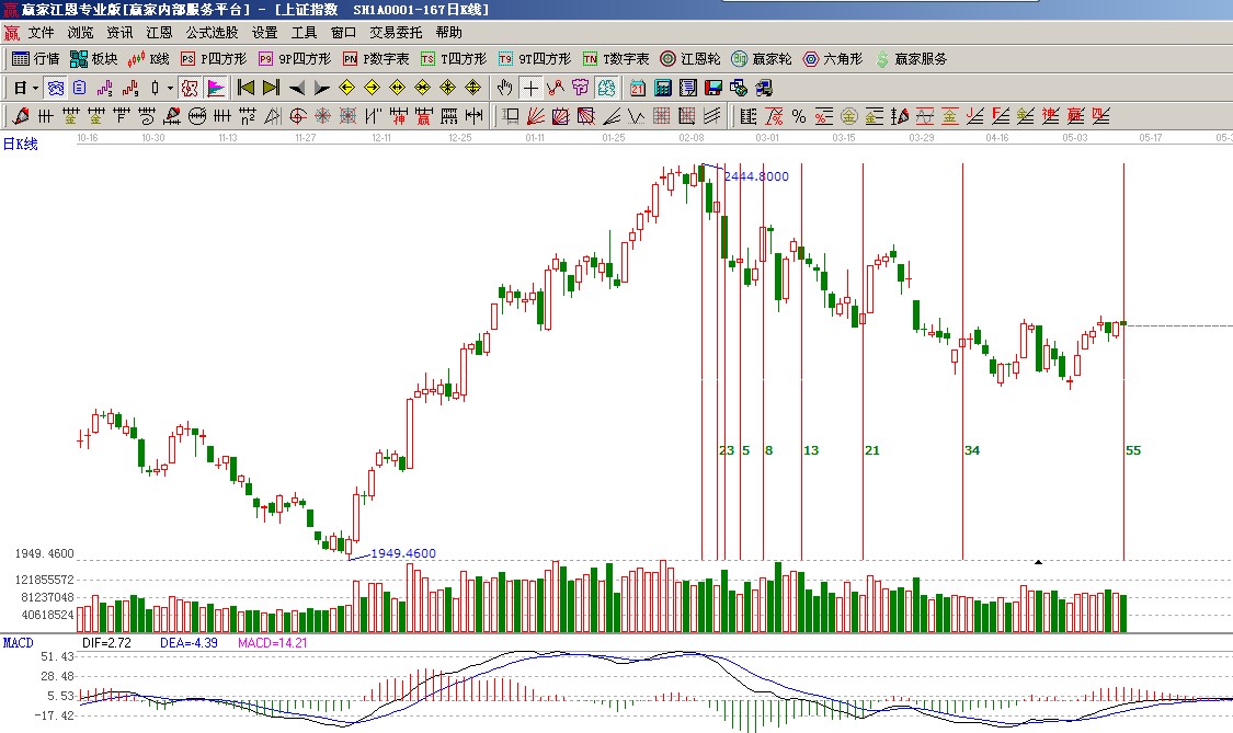 ★依據(jù)費(fèi)氏時(shí)間周期線提示:以2444點(diǎn)時(shí)間為起點(diǎn)做圖如圖(3),5月13號(hào)為時(shí)間窗;
