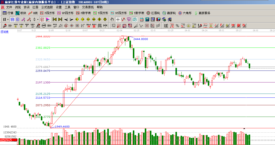 ☆依據(jù)贏家江恩系統(tǒng)黃金時(shí)間周期線(xiàn)提示:從1949點(diǎn)至2444點(diǎn)做時(shí)間圖(3),6月7號(hào)為時(shí)間窗,明天24節(jié)氣芒種市場(chǎng)風(fēng)格有望轉(zhuǎn)化為緩跌啟穩(wěn);