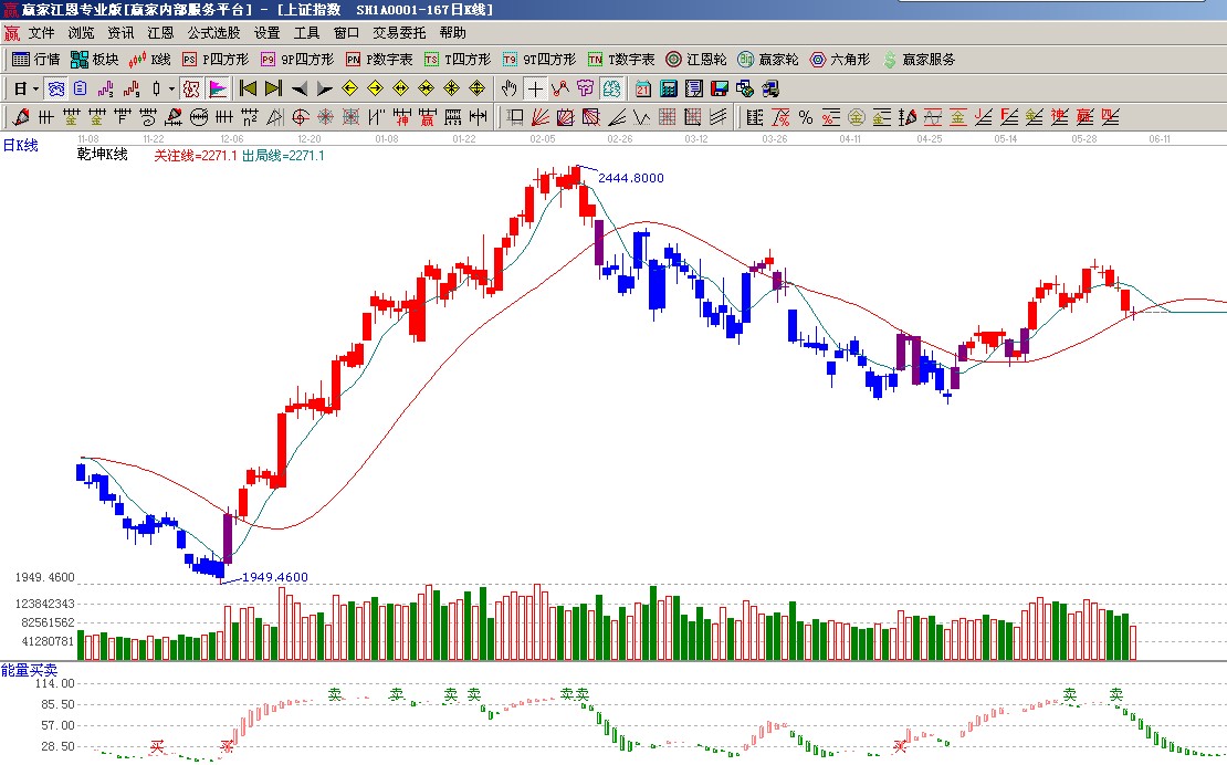 ☆依據(jù)贏家江恩系統(tǒng)能量買賣提示:提示賣出信號,空量占據(jù)優(yōu)勢,看空如圖(1);