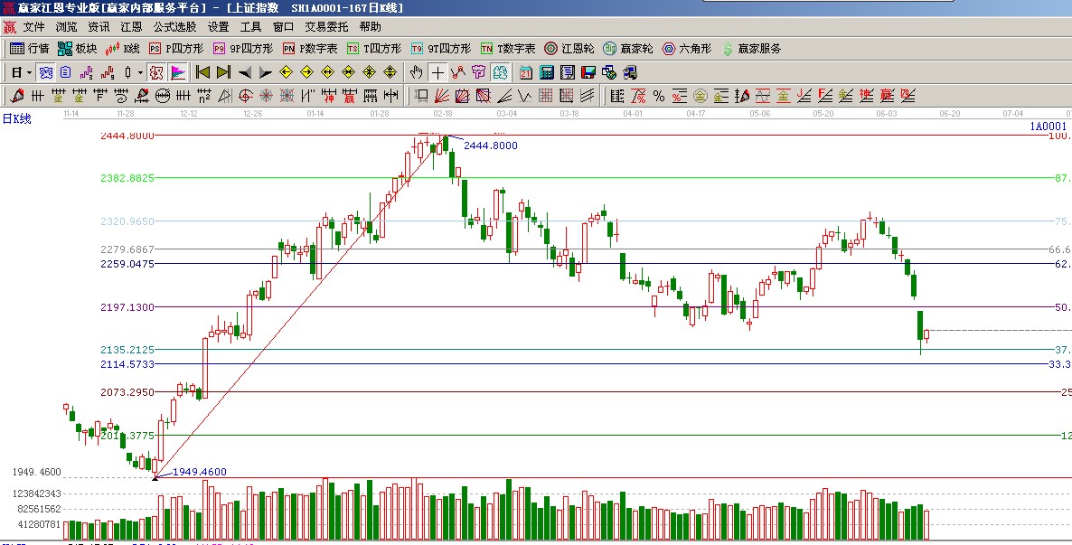 ★依據(jù)贏家江恩系統(tǒng)波段百分比提示:120度與135度(2114-2135)構(gòu)成指數(shù)當前支撐帶,180度(2197)與缺口枃成阻力帶,市場有望在江恩波段百分比震蕩帶出現(xiàn)止跌,如圖(2);