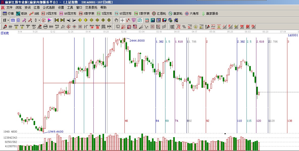 ★依據(jù)贏家江恩系統(tǒng)黃金時間周期線提示:從1949點至2444點做時間圖(3),分鐘圖時間窗18、19,日線時間窗21號;