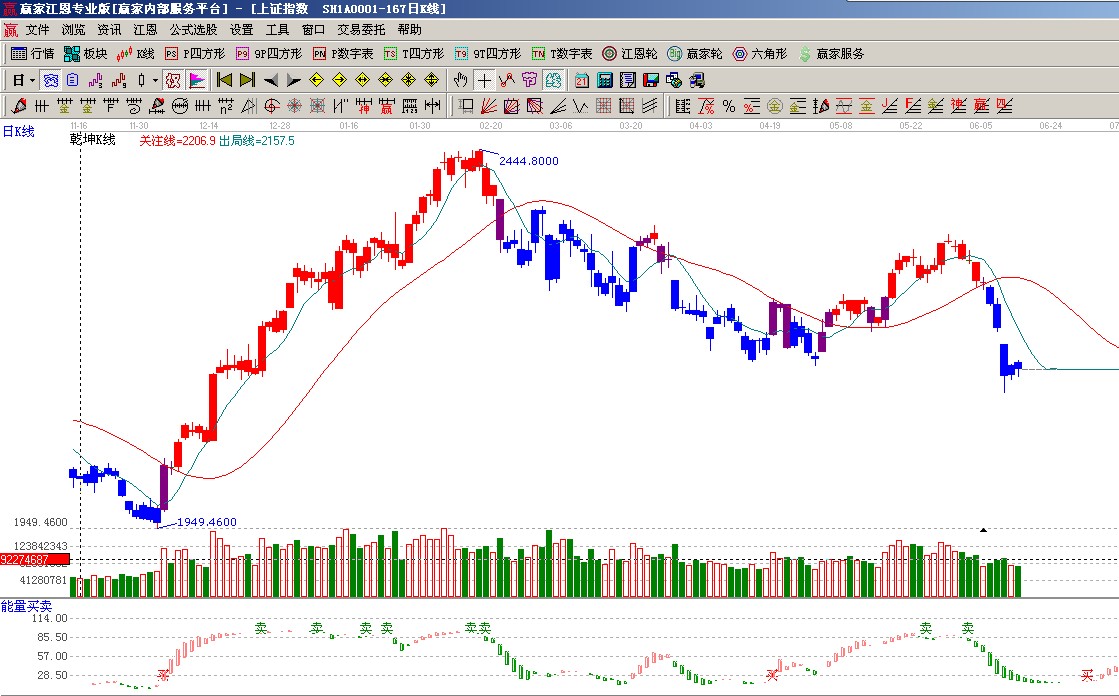 ☆依據(jù)贏家江恩系統(tǒng)能量買賣提示:綠色能量柱不斷縮短,多空未占主動權(quán)前謹慎應(yīng)對如圖(1);