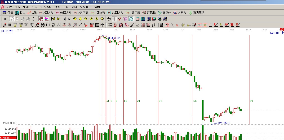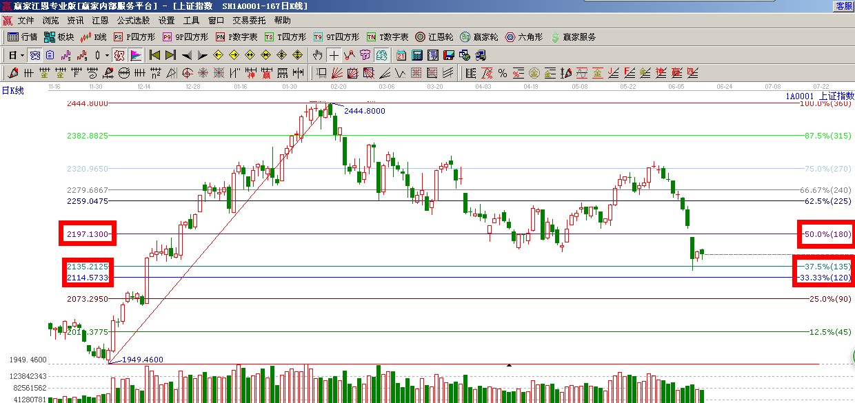 ★依據(jù)贏家江恩系統(tǒng)波段百分比提示:120度與135度(2114-2135)構(gòu)成指數(shù)當前支撐帶,180度(2197)與缺口枃成阻力帶,市場有望在江恩波段百分比震蕩帶出現(xiàn)止跌,如圖(2);