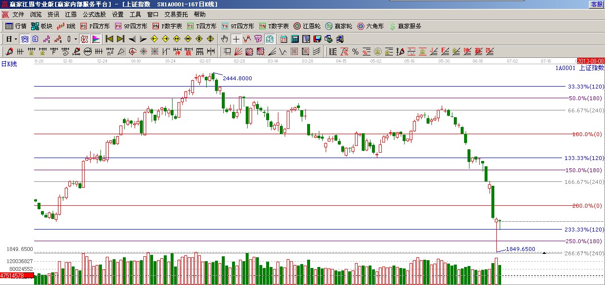 ★依據(jù)贏家江恩系統(tǒng)波段百分比延伸提示:自2478至2242做圖,支撐位是三分之一位置1925點,阻力位是零度位置2000點(2);