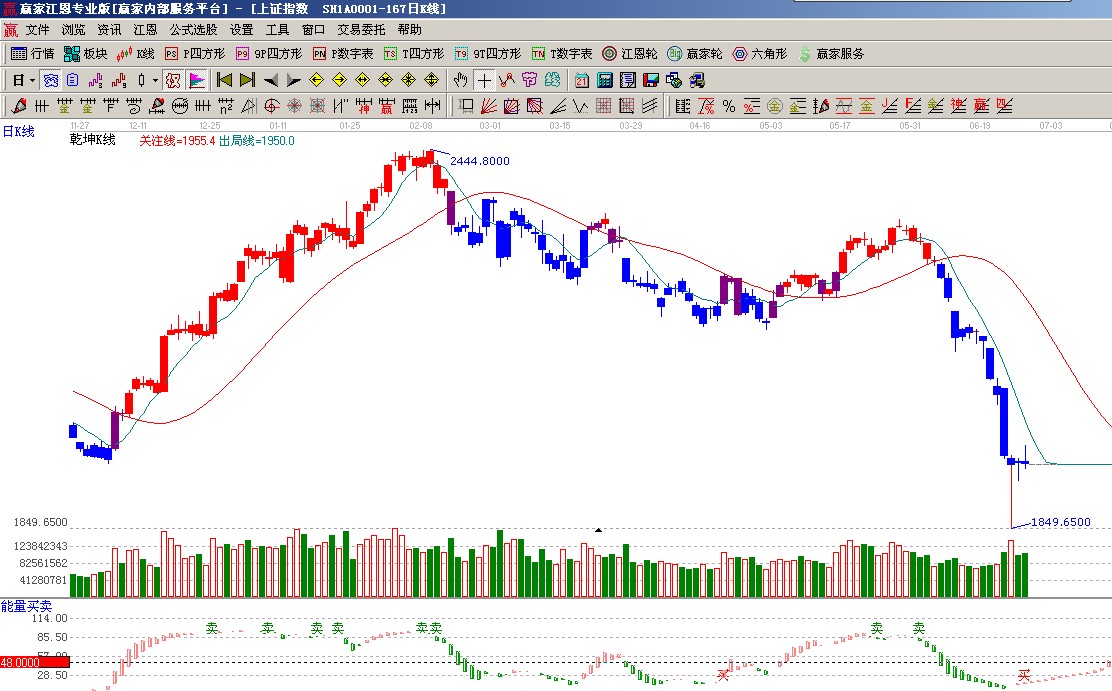 ☆依據贏家江恩系統(tǒng)乾坤K線提示: 藍色K線休息區(qū),等待K線站穩(wěn)出局線短線做多信號(1);