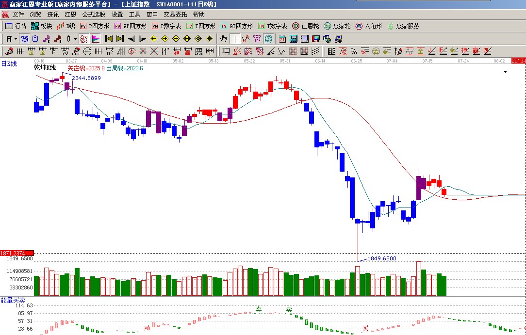 ★依據(jù)贏家江恩系統(tǒng)乾坤K線提示: K線運(yùn)行在短線出局線與紅色關(guān)注線內(nèi),不破關(guān)注線以持股為主;(1)