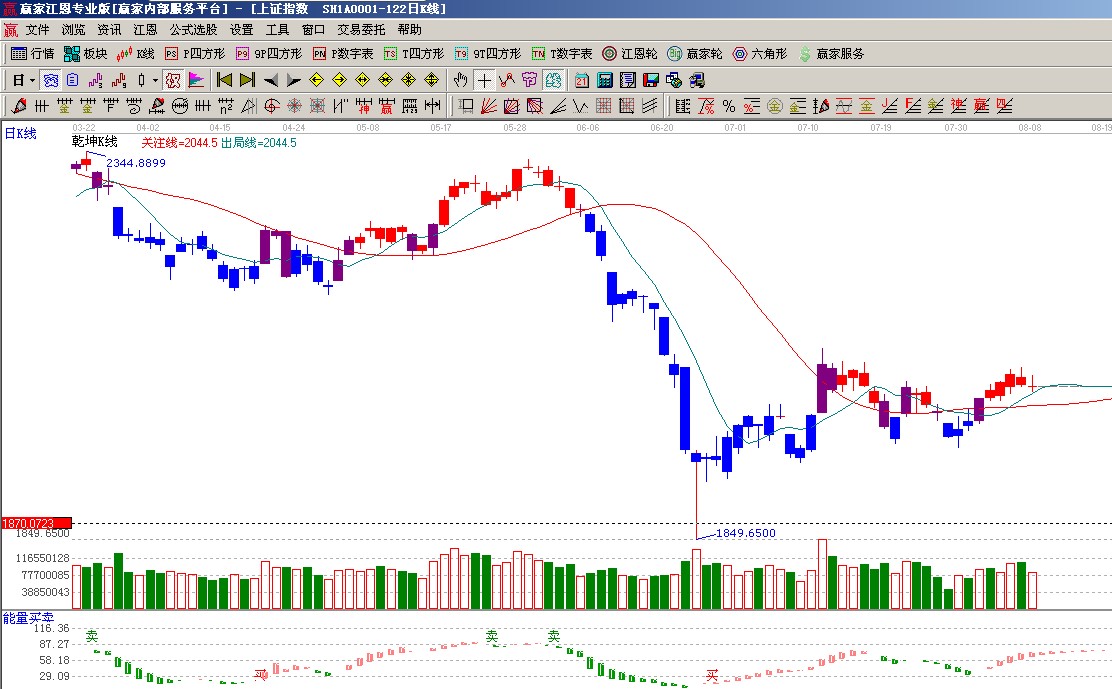 ★依據(jù)贏家江恩系統(tǒng)乾坤K線提示:十字星回踩短線出局線,依據(jù)規(guī)則K線破出局線為激進性短期多頭平倉,跌破紅色關(guān)注線則看空;(1)