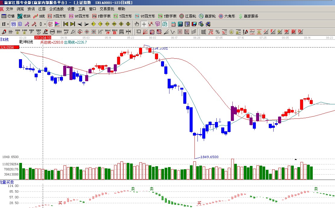 ★依據(jù)贏家江恩系統(tǒng)能量買賣提示:多頭紅色柱子消失,明日量能如再萎縮則出現(xiàn)賣出信號;(1)
