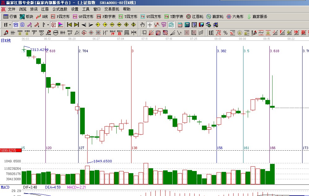 ★依據(jù)贏家江恩系統(tǒng)乾坤K線提示:K線破短線出局線,依據(jù)規(guī)則短線出局,波段減倉(cāng),等待紅色關(guān)注線(1)