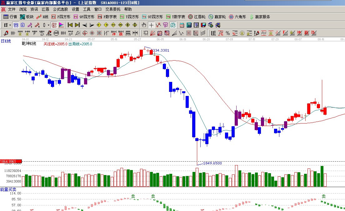 ★依據(jù)贏家江恩系統(tǒng)乾坤K線提示:K線反抽短期出局線,整體K線為紅色安全操作區(qū)(1)