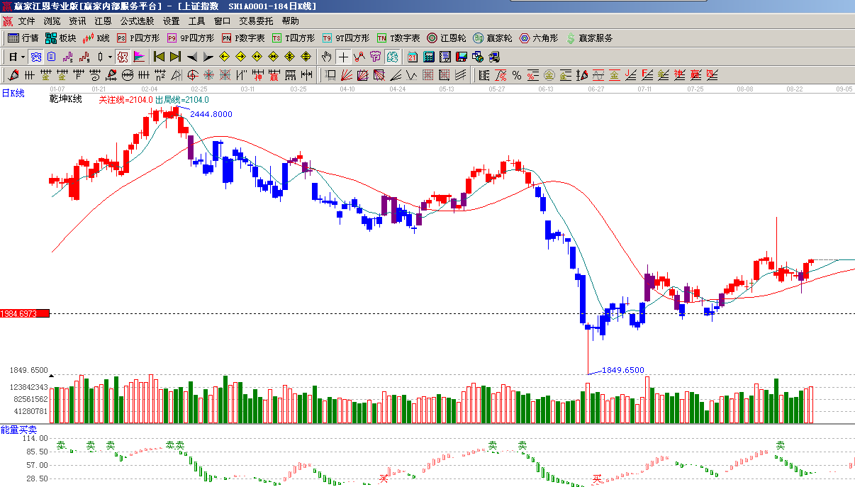 ★依據(jù)贏家江恩系統(tǒng)乾坤K線提示:短線出局線、波段關注線形成均線多頭排列,紅色K線表示看多;(1)
