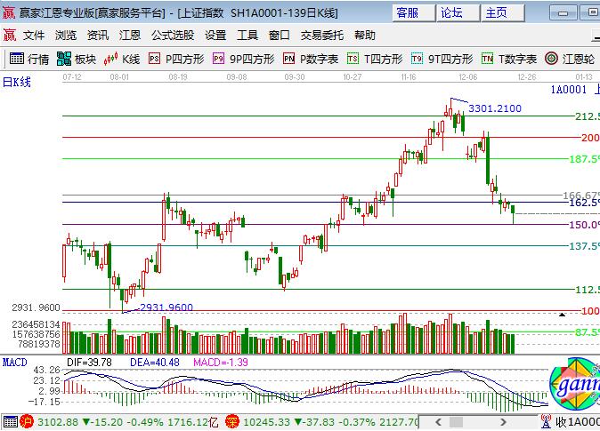 周二大盤低開一路下探至江恩百分比180度及半年線位置,尾盤權(quán)重股拉抬跌幅收窄,創(chuàng)業(yè)板勉強(qiáng)收紅。板塊方面,券商微漲,石油、銀行、保險調(diào)整拖累指數(shù),二線藍(lán)籌表現(xiàn)不佳;熱點題材混亂,小部分次新、科技股超跌反彈,短股橫行,上海國改、油改、農(nóng)業(yè)零跌,個股漲跌互現(xiàn)成交量同前日持平。技術(shù)方面,今日是大盤日線時間窗,江恩百分比180度3084點止跌回升,短周期底背離明確,此處預(yù)計展開反抽,力度能回補(bǔ)缺口就相當(dāng)不錯了,反彈結(jié)束預(yù)計市場還延續(xù)下探,因此操作上反彈中結(jié)合所持個股情況,決定是否加的1成波段倉出掉,等待二次加倉信號,3090、3080為日內(nèi)支撐,3121、3135為日內(nèi)阻力,僅供參考,不構(gòu)成任何投資建議。